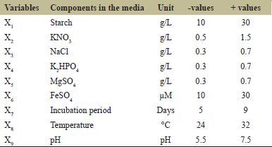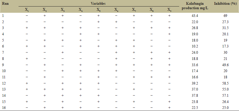 Plackett–Burman Design (PBD) was used to screen the ingredients in media for their influence on kalafungin production by Streptomyces sp. SBRK1 [26]. Using the PBD, 9 medium components including chemical and physical parameters (independent variables) were screened by representing them at two levels [Table 1], low (−) and high (+) in 16 trials [Table 2]. All the experiments were carried out in triplicate and the average activity were taken as the response (R1). The high confidence level showing variables were considered to have a significant kalafungin production.