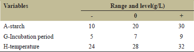 ![]() | Table 1: Low and high levels of each variable used in Plackett–Burman design. [Click here to view] |