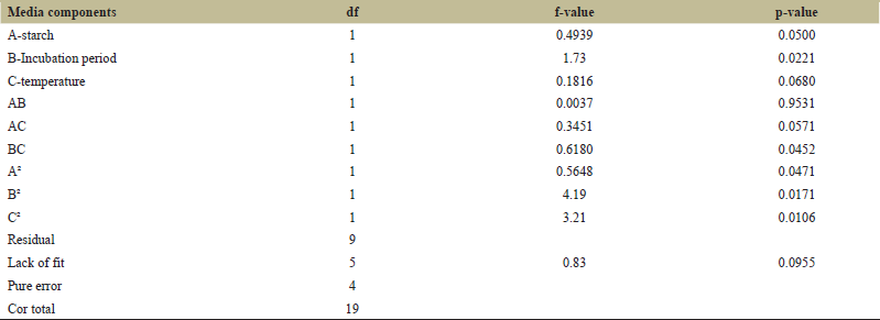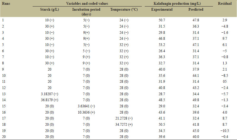 Box–Behnken, a typical Design (BBD) most commonly used RSM analysis, is chosen for optimization process to achieve maximum production of kalafungin. BBD with 20 experiments were performed for three selected factors including starch, incubation period, and temperature at three levels for optimizing kalafungin production in agar plate fermentation. Table 4 shows the design and obtained experimental responses from PBD and the runs produced considerably improved results for kalafungin production. The effects of extraction parameters and production of antimicrobial metabolites from Micromonospora and relative yield was assessed by a three-level three-factor Box–Behnken design and reported [37]. Yang et al. optimized the effective culture conditions of amoxicillin degrading bacteria using RSM [38]. Then, the polynomial model with quadratic process order to describe the correlation between the kalafungin production and the three variable equations as follows: