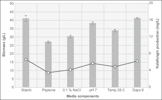 ![]() | Figure 1: The effects of kalafungin production by OFAT method (a) Biomass production and (b) of various selected components in optimized media. [Click here to view] |