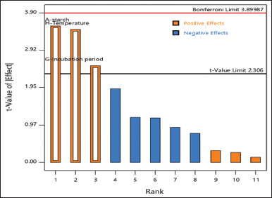 ![]() | Figure 2: Pareto chart shows the ranking of factors which influences the production of kalafungin, a beta lactamase inhibitor. [Click here to view] |