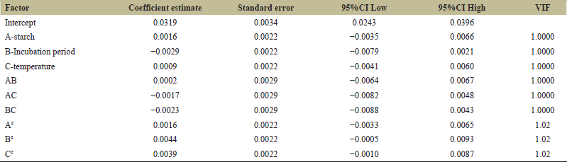 Where Y is the predicted response, β0 model constant; X1, X2, and X3 are independent variables; β1, β2, and β3 are linear coefficients; β12, β13, and β23 are cross product coefficients; and β11, β22, and β33 are the quadratic coefficients [27]. The Box–Behnken designs were further subjected to first order and second order multiple regression analysis by least-square regression analysis to obtain the mathematical model parameters. Significance of experimental values was derived from the software results from model coefficients, R2 values, and F values.