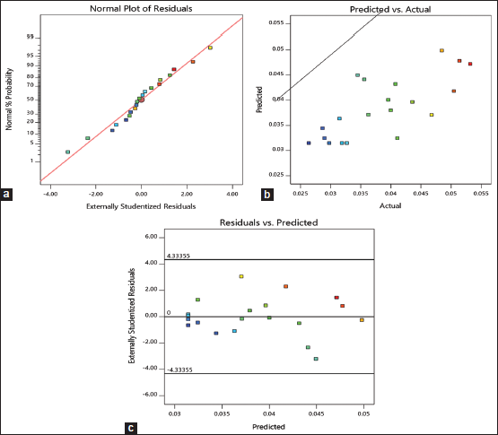 ![]() | Table 3: Low, intermediate, and high levels of three independent variables used in RSM. [Click here to view] |