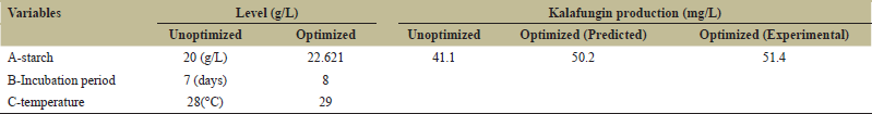 RSM designs for optimizing the process parameters have been employed successfully in microbial fermentation for enhanced growth and production of kalafungin. The regular methods used for optimization was inappropriate and failed to consider the interactions between the growth factors. Non-statistical one factor-at-a-time approach gave the betterment of suitable carbon, nitrogen sources, and other physical parameters (pH, temperature, and incubation period) for growth and secondary metabolite production. In this investigation, production of β-lactamase inhibitor kalafungin was enhanced by optimized nutritional and physical growth factors. The maximum kalafungin production of 51.4 mg/L was obtained under optimized conditions than the unoptimized (41.1 mg/L) media with the following optimized factors; starch 22.621 g/L, incubation period of 8 days and temperature at 29°C which is 25.06% more than the unoptimized conditions. The analysis was apparent that PBD and RSM were found more satisfactory for identifying the most significant medium composites with feasible number of experimental trials. Further this study may be useful to develop any large scale fermentation process for the proficient production of targeted metabolite(s) from Streptomyces.