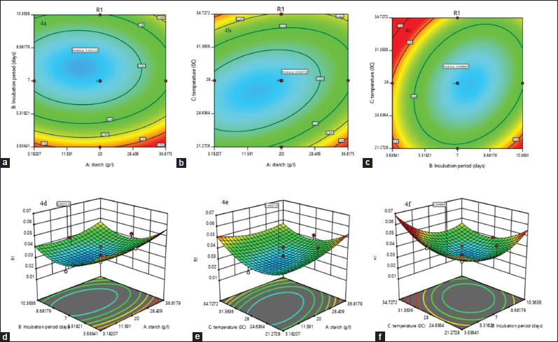 ![]() | Figure 4: ContourPlot and response surface plots showing interactive effects of selected variables (a and d) the interaction of starch and incubation period; (b and e) the interaction of starch and temperature; (c and f) the interaction effect of incubation period and temperature; on kalafungin production by Streptomyces sp. SBRK1. [Click here to view] |