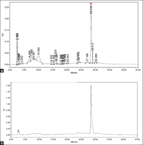 ![]() | Figure 5: (a) HPLC profile of kalafungin extracted from Streptomyces sp. SBRK1 under optimized condition. *The peak area of kalafungin with the retention time 28.515 min. (b) HPLC spectrum of pure kalafungin. [Click here to view] |