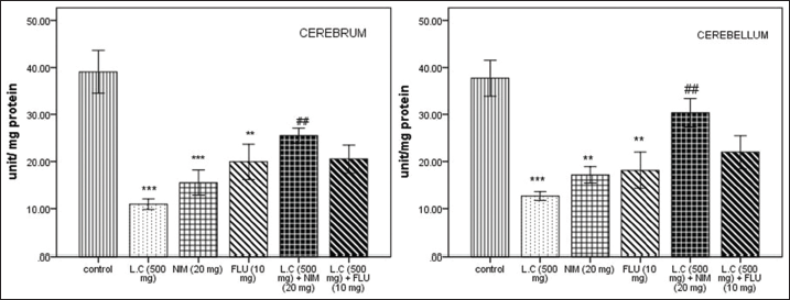Antioxidant enzymes are the first cellular molecules required for defense against ROS generation. The first enzyme of the enzymatic antioxidative pathway is SOD which converts superoxide anions into peroxides and then to water by CAT and GPx. Thus, in the present work, increased oxidative stress was evident by significant decreased GPx (P < 0.001) [Figure 1] and SOD (P < 0.001) [Figure 2] levels in cerebrum and cerebellum as compared to those of controls. Furthermore, there is a significant alteration in CAT level (P < 0.001), [Figure 3] in comparison to control groups. These make the agreement with the fact that L. camara reduced the total antioxidant levels enhancing imbalance between pro-oxidant and antioxidant potentials. These changes were significantly attenuated when co-treated with NIM and FLU.