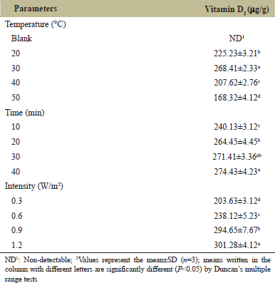 Preliminary experiments were performed to select an appropriate exposure time, UV-B intensity, and ambient temperature. First, a range of temperature (20–50°C) selected keeping exposure time and UV-B intensity constant at 20 min and 0.6 W/m2 , respectively. Second, UV-B intensity varied from 0.3 to 1.2 W/m2 , and the optimal temperature was taken as 30°C from the first step, keeping exposure time constant at 20 min. Finally, using optimal temperature and intensity obtained from the previous two steps, exposure time varied from 10 to 40 min. On the basis of these results, the upper, middle, and lower levels of the independent factors were selected for RSM.