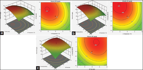 Figure 1b indicates that under lower values of temperature, the irradiation intensity resulted in a linear rise in the Vitamin D2 synthesis while exposure time was fixed at 20 min. Furthermore, the ambient temperature shows a quadratic effect on the outcome. Figure 1c indicates the effects of the interactions between exposure time and UV-B intensity with a similar tendency.