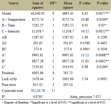 ![]() | Table 3: ANOVA results for the response surface quadratic model. [Click here to view] |