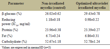 Reducing power of UV irradiated mycelia (0.98±0.22 mg/ml) was slightly improved than non-irradiated control samples (1.18±0.18 mg/ml). No significant changes were found in the contents of protein, fat, and carbohydrate after mycelial UV treatment [Table 4]. Similar observations in UV irradiated oyster mycelia were also reported by Huang et al. (2015) and Simon et al. (2011). Our results in this regard are corroborated by their findings. A detailed study is still to be done for effects of UV-B irradiation on other bioactive compounds in the submerged cultivated mushroom mycelia.