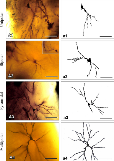 Overall, soma size, dendritic length, and spine density of unipolar, bipolar, pyramidal, and multipolar neurons of HCC were found in ascending order (minimum in unipolar and maximum in multipolar), respectively (Fig. 3).