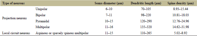 ![]() | Table 1: Measures of neuronal entities of projection and local circuit neurons in the HCC of C. benghalensis. [Click here to view] |