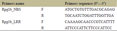 The DNA sequences of disease resistant gene, Rpg1b (G. max), were retrieved from NCBI [26] and multiple sequence alignment (MSA) was performed using ClustalW [27]. After the alignment results, the conserved region was taken and both the primers (forward and reverse) were designed using online tool/software, namely, Primer3.
