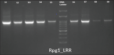 ![]() | Figure 2: Gel description of samples S1 to S9 with primer Rpg1b_LRR where well 1: NRC-37, well 2: JS-20-69, well 3: JS-20-98, well 4: NRC-86, well 5: JS-20-29, well 6: 100 bp ladder, well 7: NRC-7, well 8: RVS-2001-18, well 9: NRC-121, and well 10: JS-20-34 (Band approx. 900 bp). [Click here to view] |