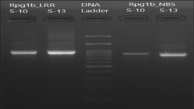 ![]() | Figure 3: Gel description of the samples S10 (JS-97-52) and S13 (NRC-12) with primers Rpg1_LRR and Rpg1_NBS. [Click here to view] |