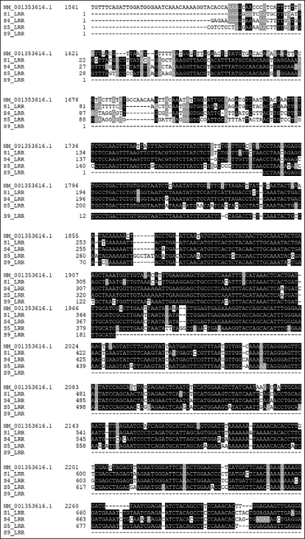 The previous studies have reported the amplification of disease resistance genes using PCR among numerous plant varieties [16,17,29]. In this study, using the primers for the NBS and LRR region of Rpg1b gene of Williams 82 soybean variety, we have amplified the NBS and LRR sequences from different Indian varieties of G. max. Yu et al. [30] reported the amplification and cloning of NBS sequences from soybean using degenerate primers of N and RPS2 genes of tobacco and Arabidopsis, respectively. Chang et al. [31] have also reported the characterization of disease resistance loci in the USDA soybean germplasm collection using genome-wide investigations.