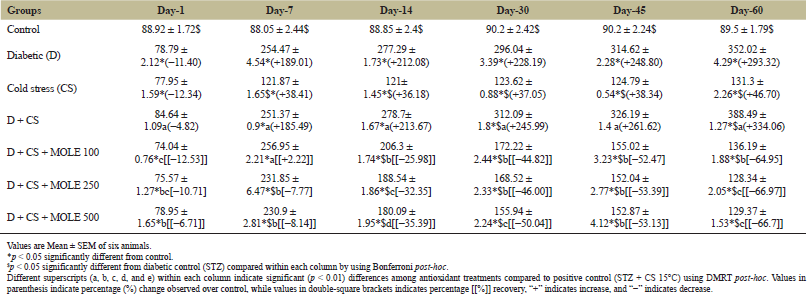 The blood glucose levels monitored in experimental rats displayed a hyperglycemic state. On day-60, the diabetic rats showed higher glucose levels while cold-stressed groups at 15°C had significantly moderate glucose levels from that of control (Table 1). Co-exposure to diabetes, as well as cold stress, revealed a higher impact on glucose levels. The MOLE-supplemented groups showed a remarkable recovery of blood glucose levels from day14 onwards (Table 1). On day-60th, among MOLE-supplemented groups, doses at 250 and 500 mg/kg bw/day showed significantly low levels of glucose when compared to a positive control (Group-IV).