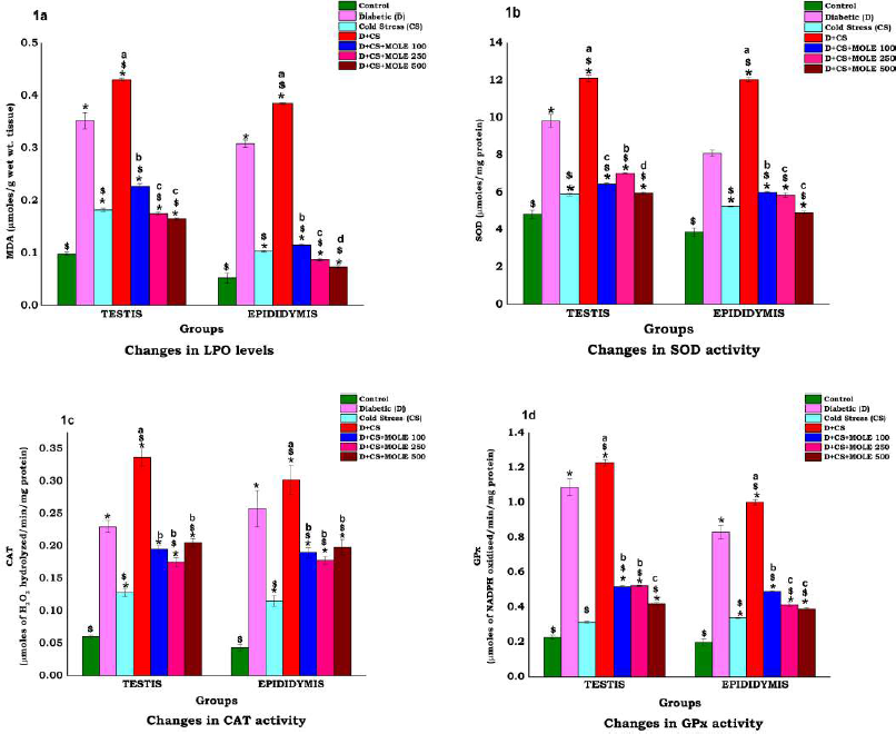 The GSH levels (Fig. 2b) were found to be decreased (p < 0.05) upon exposure to cold stress. In the testis, the co-exposure caused a significant (p < 0.05) exacerbation by suppressing the GSH content. Among MOLE-supplemented groups, 500 mg/kg bw/day dose helped to augment GSH levels.