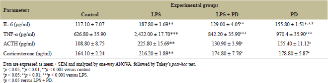 The result of ACTH and corticosterone level is summarized in Table 1. The plasma ACTH and corticosterone levels were significantly increased (p < 0.01) in LPS-challenged mice compared to control. In Tukey’s multiple tests, the LPS + PD and PD groups revealed substantially increased ACTH (p < 0.05 for both) and corticosterone (p < 0.05 for both) compared to the LPS-exposed group. Compared to control, LPS and LPS + PD, other groups showed no significant change in ACTH/corticosterone level.