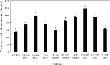 Various concentrations of BAP, kinetin, and TDZ increased the cumulative uptake of vase solution as compared to untreated flowers. It was found that the 100 µM TDZ concentration was most effective in increasing uptake of vase solution (118 ml/spike) by flower spike followed by 0.5 mM BAP (98.66 ml/spike) and 1 mM kinetin (95.00 ml/spike) as compared to control (53.99 ml/spike) (Fig. 3).