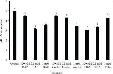 There was a remarkable difference in pH value of cytokinin treated flowers and control. The BAP (0.5 mM), kinetin (1 mM), and TDZ (100 µM) acidified (pH 3.17, 3.45, 3.00, respectively) (Fig. 4) the vase solution. When the pH of vase solution was lowered the vase solution travelled faster in the water conducting system.At this pH, the bacterial growth might be reduced, thus improving water uptake. Gowda and Gowda [36] also showed that aluminum sulfate treated flowers lowered the pH of vase solution and reduced the growth of microbes in vase solution during senescence.