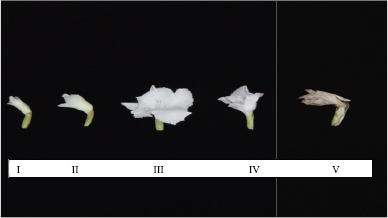 ![]() | Figure 5: Different stages of flower development of Gladiolus. I stage—Slightly opened/point brush stage; II stage—Half opened stage; III stage—Fully opened stage; IV stage—Incipient senescence stage; V stage—Senescent stage. [Click here to view] |