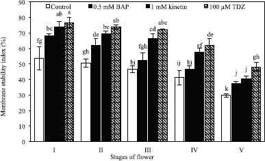 A linear decline in MSI was observed in both cytokinin treated and untreated flowers during the flower development process (Fig. 5). There was a significant difference in MSI cytokinin treated flowers and control. The decrease in MSI was significantly alleviated at stage V by treatment with 100 µM TDZ (62.07%) followed by 0.5 mM BAP (36.76%) and 1 mM kinetin (25.75%) in comparison to control (Fig. 6).