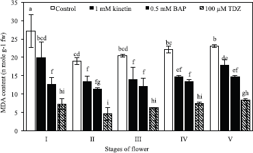 Lipid peroxidation level was studied in terms of MDA content and decrease in the MDA content was observed till stage II, then gradual increase was observed till stage V in both cytokinin treated flowers and in control. Cytokinin-treated flowers had decreased amount of MDA content throughout flower development as compared to the untreated flowers. MDA content displayed a decrease by 63.70% in flowers treated with TDZ that is followed by BAP and kinetin where the MDA content was reduced by 36.72% and 22.53%, respectively, as compared to untreated flowers where MDA level was maximum (Fig. 7).