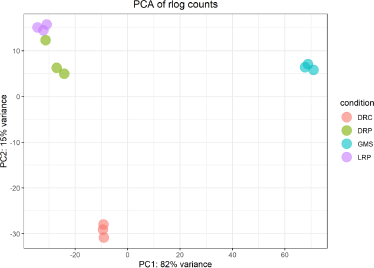RNA-Seq was used to characterize changes in A. niger gene expression due to growth on media containing peanut or cashew nut flour or a standard glucose control media. Reads were mapped to the A. niger ATCC 1015 reference genome and expression values were calculated (regularized log counts) for each annotated gene, with an average of 92% of the reads aligning to the reference, and 75% of all reads aligning to exons. Principle component analysis of A. niger gene expression for the cultures grown in each of the different media for 24 hours indicated three clearly discernable gene expression profiles (Fig. 1). The transcriptional responses of fungi grown on GMS and DRC were relatively more distinct, while cultures grown in both LRP and DRP were more similar. Transcriptome studies are a common strategy to characterize gene expression relevant to a given process or target organism. Similar studies have characterized the transcriptional response of Aspergillus species to growth on sugarcane bagasse for biomass processing [29,30]. Further, food grade enzymes from A. oryzae have been evaluated for use in wheat gluten detoxification as well as digestion of peanut and cashew allergen digestion [11,31,32]. This strategy has also been used to characterize several topics related to aflatoxin-producing Aspergillus species. For example, transcriptional studies have been used to characterize regulators of aflatoxin production [33,34] as well as growth response to water limitation and temperature fluctuation [35,36]. Conversely, the transcriptional response to Aspergillus flavus infection in peanut plants has been used to identify genes involved in the resistance mechanism to fungal infection and the interplay between fungus and plant during infection [31,37,38]. These types of studies provide useful information on genes that can be used to enhance host plant resistance to contamination by A. flavus using conventional breeding or transgenic approaches such as overexpression of resistance-associated genes or host-induced gene silencing strategies [39–41].