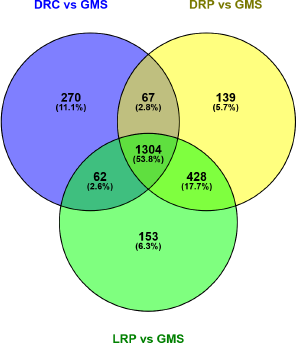 There were 153 differentially regulated genes unique to LRP, while 139 genes were unique to DRP when compared to growth on GMS media (Fig. 2). Of these, 121 were upregulated in LRP and 87 in DRP (Supplementary Table S1). Many of these genes, 65 (42%) in LRP and 87 (63%) in DRP, encoded hypothetical proteins. Further, in both cases, several of the most highly upregulated genes (50-fold or more) unique to the LRP or DRP media encoded hypothetical proteins.