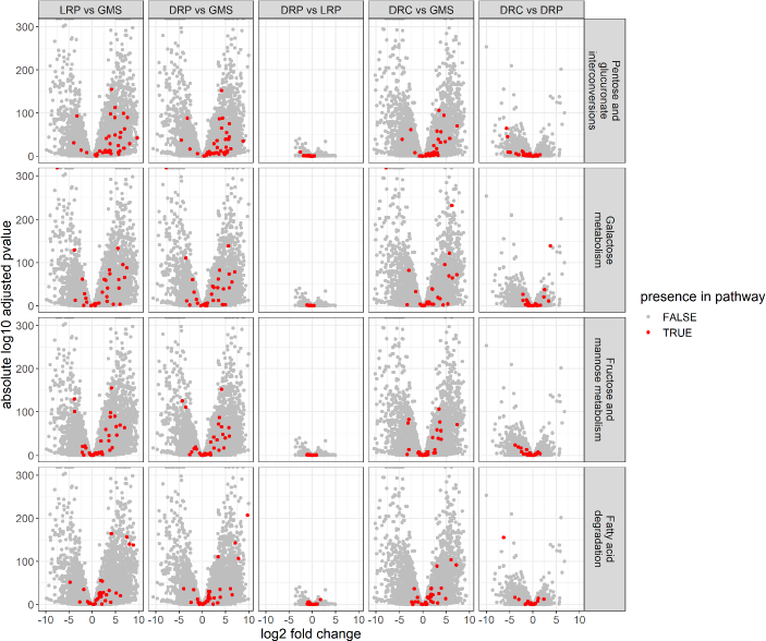 ![]() | Figure 4: Volcano plots of differential gene expression responses comparing LRP, DRP, and DRC to GMS media, DRP to LRP, and DRC to DRP. Genes present in the pentose and glucuronate interconversion pathway enzymes (A), galactose metabolism pathway enzymes (B), fructose and mannose metabolism pathway enzymes (C), and fatty acid degradation (D) are highlighted in red. KEGG pathways are labeled at the right of each plot, log2 fold change indicated on the x-axis, and the absolute log10 adjusted pvalue on the y-axis. [Click here to view] |