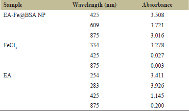 ![]() | Figure 1: UV-vis spectrum (EA-Fe@BSA NP). [Click here to view] |