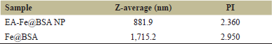 ![]() | Figure 5: DLS result (EA-Fe@BSA NP). [Click here to view] |