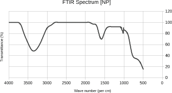 Absorbance values at 425 and 875 nm for the NP system, 20 hours after the addition of EA, were seen to be 3.508 and 3.016, respectively (Fig. 1 and Table 1). This revealed no significant aggregation in the synthesized NP after the latest addition of EA [6], and the highest peak obtained at 609 nm may be attributed to the characteristic d-d electronic transition consistent with the formation of an EA-Fe complex. FeCl3 showed high absorbance peaks between 300 and 400 nm (Fig. 2 and Table 1), proving no external contaminations but possibly the presence of excess, unconverted Fe(III) [7]. Two absorbance peaks of 3.411 and 3.926 were observed for EA at 254 nm and 283 nm, respectively, in Figure 3 which is within the expected, standard range for a neutral pH-range solution [8]. However, an absorbance of 1.145 at 425 nm was also observed, which is suspected to be residual EA having been dissociated from the EA-Fe complex.