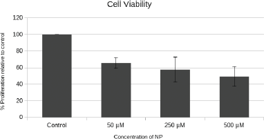 ![]() | Figure 7: A549 proliferation relative to control at 0, 50, 250 and 500μM EA-Fe@BSA NP. [Click here to view] |