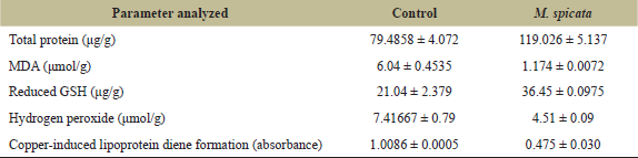 ![]() | Table 2. Effect of M. spicata on oxidative stress markers using an isolated goat lens model. [Click here to view] |