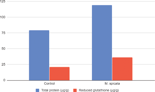 Antioxidant defenses in plants lead to the reduction in oxidative stress, delaying cataractogenesis. A decrease in levels of GSH is related to cataract formation. In the present investigation, the level of GSH in the lens homogenate of the toxic group was found to be lower (21.04 ± 2.37 μg/g) in comparison to 100 μg/ml methanolic extract of M. spicata (36.45 ± 0.097 μg/g) (Fig. 2). The reduced form of GSH plays an important role in stabilizing proteins, thus acting as an antioxidant. GSH also helps in protecting and preserving lens clarity. A decrease in GSH leads to an increase in Glutathione disulfide oxidized (GSSG) levels and hence protein crosslinking, decreased solubility, and transparency [17]. Conversion of oxidized GSH (GSSG) to reduced GSH by the enzyme GSH reductase maintains the normal GSH levels in healthy lenses [18]. Reduced GSH levels were found to be restored by MoringaM. oleifera extract, thereby warranting its anticataract potential [19].