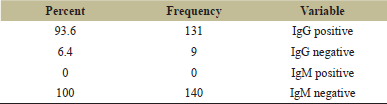 The study group included all women who were referred to the Al-Mahdi Women’s Clinic in the south of Tehran in the interval of 9 months in 2020. They were 140 women who were referred to the laboratory for prepregnancy tests. One of the prepregnancy tests was to determine the amount of serum rubella antibodies of both types immunoglobulin G (IgG) and Immunoglobulin M (IgM). The mentioned antibodies were tested by quantitative immunoassay using Immulite 2000 autoanalyzer (Siemens, Munich, Germany), according to the kit manufacturer’s instructions. All positive and suspicious results of antibodies were tested again.