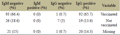 Results for IgG and IgM rubella antibodies were interpreted according to manufacturer’s instructions as follow: for IgG (nonreactive: < 6.5, inter: 6.5–8, and positive: > 8) and for IgM (nonreactive: < 0.9, inter: 0.9–1.1, and positive: > 1.1). Statistical analysis was performed using Statistical Package for the Social Sciences software.