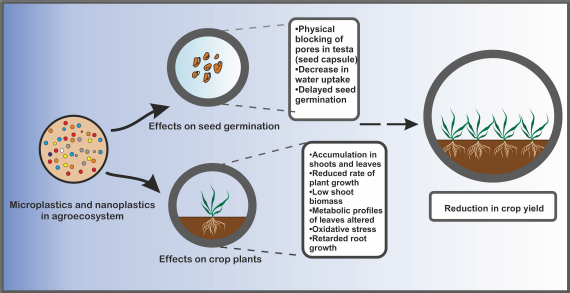 Boots et al. [39] studied effects of different MPs (biodegradable PLA, HDPE, and microplastic clothing fibers) on perennial ryegrass. They reported that plastics reduced the number of ryegrass seeds that germinated. They hypothesized that this reduction can be blockage of seed capsule by plastic particles. Another study conducted by Pflugmacher et al. [40] reported that the germination speed and as a consequence germination rate index of seeds of garden cress, L. sativum, got reduced when treated with polycarbonate granules and its leachates. Germination rate of seeds is measured by germination rate index which gives the percentage of germination on each day of germination period [28]. The implication of this study can be that if too many plastic particles and their leachates gets mixed with agricultural soil then it can result in delayed growth and lesser germination rate index which can further affect crop yield [40].