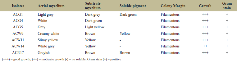 ![]() | Figure 1: (a) Phenotypic characterization and (b) Microscopic view of S. atacamensis (ACG1). [Click here to view] |