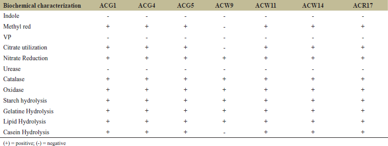 Isolated bacteria were identified by cultural characteristics such as abundance of growth, colour change in media, and morphological characteristics like form, size, margin, elevation studied on culture plate. Identified the isolates by Gram’s staining, catalase, oxidase, nitrate reduction, IMVIC test, carbohydrate utilization, gelatine hydrolysis test, were performed for the confirmation of bacterial isolates according to the Bergey’s manual [20].