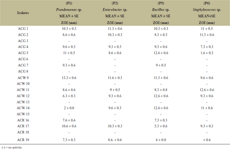 ![]() | Table 4: Primary screening was done by cross streak method and active isolates were calculated based on zone of inhibition between actinobacteria strain and test uropathogens. [Click here to view] |