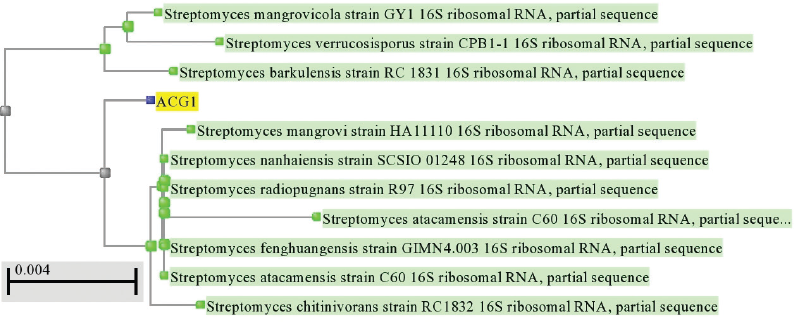 The selected actinobacteria strain was identified by 16S ribosomal ribonucleic acid (rRNA) gene sequence was followed by Ref [29] from Biokart India Pvt Ltd Bangalore, Karnataka. Universal primers were used to amplify 16S rRNA. Thirty-five cycles were performed with the actino specific forward primer (5´-GGATGAGCCCGCGGCCTA-3´) and the actino specific reverse primer (5´-CGGTGTGTACAAGGCCCGG-3´). After ethidium bromide staining, polymerase chain reaction (PCR) amplification was detected using agarose gel electrophoresis. Then PCR product was sent to sequencing by automated sequence method. For sequencing, the same primers as previously reported were used. Further, National Center for Biotechnology information-basic local alignment search tool was also used to compare the sequence similarity of the actinobacteria strain. The 16S rRNA a sequence of actinobacteria was deposited under GenBank. The original data set was re-sampled toll, 100 times using the phylogeny bootstrap program to obtain the confidence values for bootstrap analysis. The MEGA 4 software was used to create the phylogenetic tree using the bootstrapped data set. Using the neighbour joining method [30], the multiple distance matrixes were used to construct a phylogenetic tree.