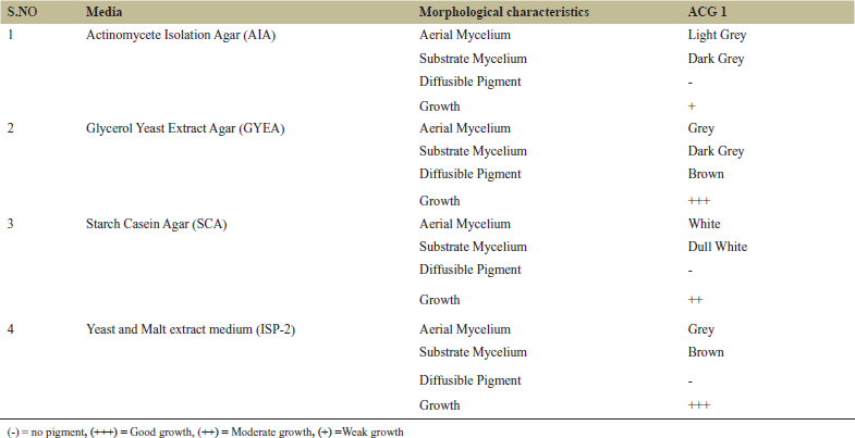 ![]() | Table 5: Morphological feature of Streptomyces atacamencis (ACG1) on different culture media ( AIA, GYEA, SCA ISP-2) was done by phenotypic visualization. [Click here to view] |