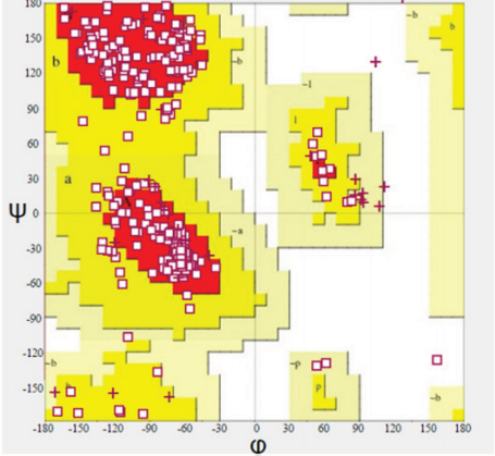 ![]() | Figure 2. Ramachandran plot of homology modeled protein. [Click here to view] |