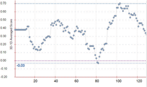 In the Ramachandran plot (Figure 2), 93.6% of the residues were in the favored region, 5.6% were in allowed region, and 0.8% was in outlier region, thus showing that it is a reliable structure. From Verify-3D result (Figure 3), it was known that 88.67% of the residue had an average 3D-1D score of 0.2, which again showed that the structure is good. A minimum of 80% of the amino acids must have a score of 0.2 in the 3D/1D profile of Verify-3D, which in this case was satisfied.