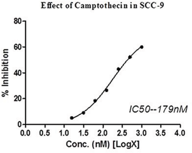 The concentration of Camptothecin needed to inhibit cell growth by 50% (IC50) values is generated from the dose–response curve. IC50 values were derived from a nonlinear regression analysis based on sigmoid dose–response curve and visualized using GraphPad Prism version 5.0 software.