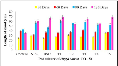 ![]() | Figure 5: Shoot length of rice cultivar CO-51 treated with BSC and Musa spathe extracts—pot culture experiment. [Click here to view] |
